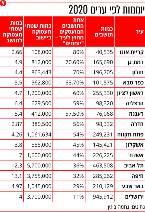 "בקריית אונו, אשקלון וחדרה שטחי התעסוקה לנפש נמוכים מאוד, עם פחות מ-4 מ"ר פר תושב, ותופעת היוממות מהן גבוהה מאוד", מסבירה בוגין את הממצאים. "רוב התושבים בגיל העבודה מועסקים מחוץ לעיר. גם ברמת גן כמות שטחי התעסוקה לנפש נמוכה באופן יחסי (4.9 מ"ר לנפש) ואחת הסיבות לכך היא הקרבה המשמעותית לתל אביב ולבני ברק. בין השנים 2019-2017 הוסיפה רמת גן רק 887 מ"ר של שטחי תעסוקה לעיר".