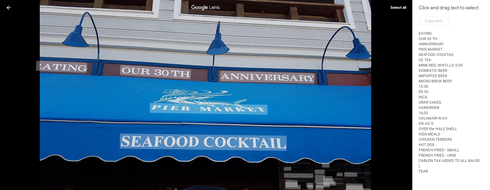גוגל תמונות התחדשה ממש לאחרונה ביכולת לזהות ולהעתיק טקסטים מתוך התמונות שלכם. זה אומר שברגע שגוגל מזהה שיש כיתוב בתמונה - למשל צילום של רשימה, תפריט, מודעה, שלט וכדומה, טכנולוגיית הלנס נכנסת לפעולה ומציעה לכם לסמן ולהעתיק את הטקסט ישירות מהתמונה. אפשר לשער שזו רק ההתחלה, ושבקרוב נתחיל לראות עוד ועוד פיצ'רים המבוססים על טכנולוגיית לנס עושים דרכם אל אלבום התמונות הדיגיטלי שלנו בגוגל.
