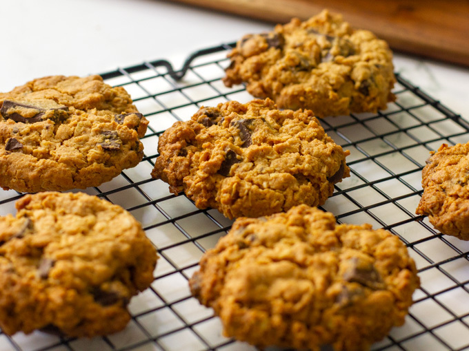 - מוסיפים שיבולת שועל, קמח, אבקת אפייה, סודה לשתייה וקורט מלח ומעבדים רק עד שהחומרים נטמעים בתערובת. מוסיפים שוקולד מריר קצוץ ומערבבים. חשוב לא לערבב את התערובת יותר ממה שצריך, בין אם במיקסר או בעזרת כף.