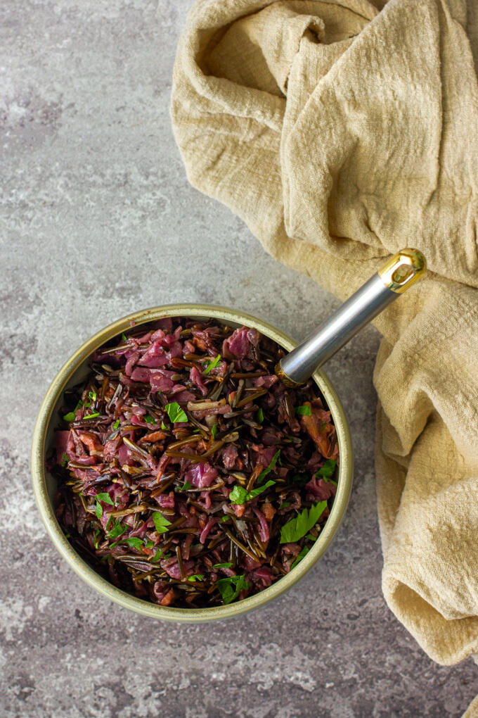 - מוסיפים את האורז בר, חומץ ומים. מערבבים היטב, מכסים ומביאים לרתיחה. מנמיכים לאש קטנה (לא אש מינימום – פשוט אש קטנה) ומבשלים בין 50-60 דקות. מידי פעם כדאי לערבב את התבשיל ואם בשלב מסוים חסרים מים ניתן להוסיף מעט, עד מקסימום של חצי כוס נוספת. התבשיל מוכן שאורז הבר נפתח והמים מתאדים לחלוטין. משאירים את הסיר מכוסה כ-5 דקות נוספות לאחר תום הבישול.