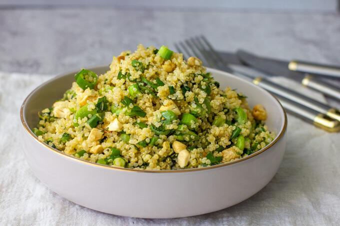 - בקערת ערבוב מניחים את כל מרכיבי הסלט – קינואה מבושלת, פולים ירוקים מבושלים, בצל ירוק קצוץ, נענע קצוצה, גרידת לימון, שום כתוש, אגוזי קשיו קצוצים גס, 3 כפות שמן זית, מיץ לימון, מלח ופלפל ומערבבים. אפשר לשמור במקרר במיכל אטום עד 4 ימים.